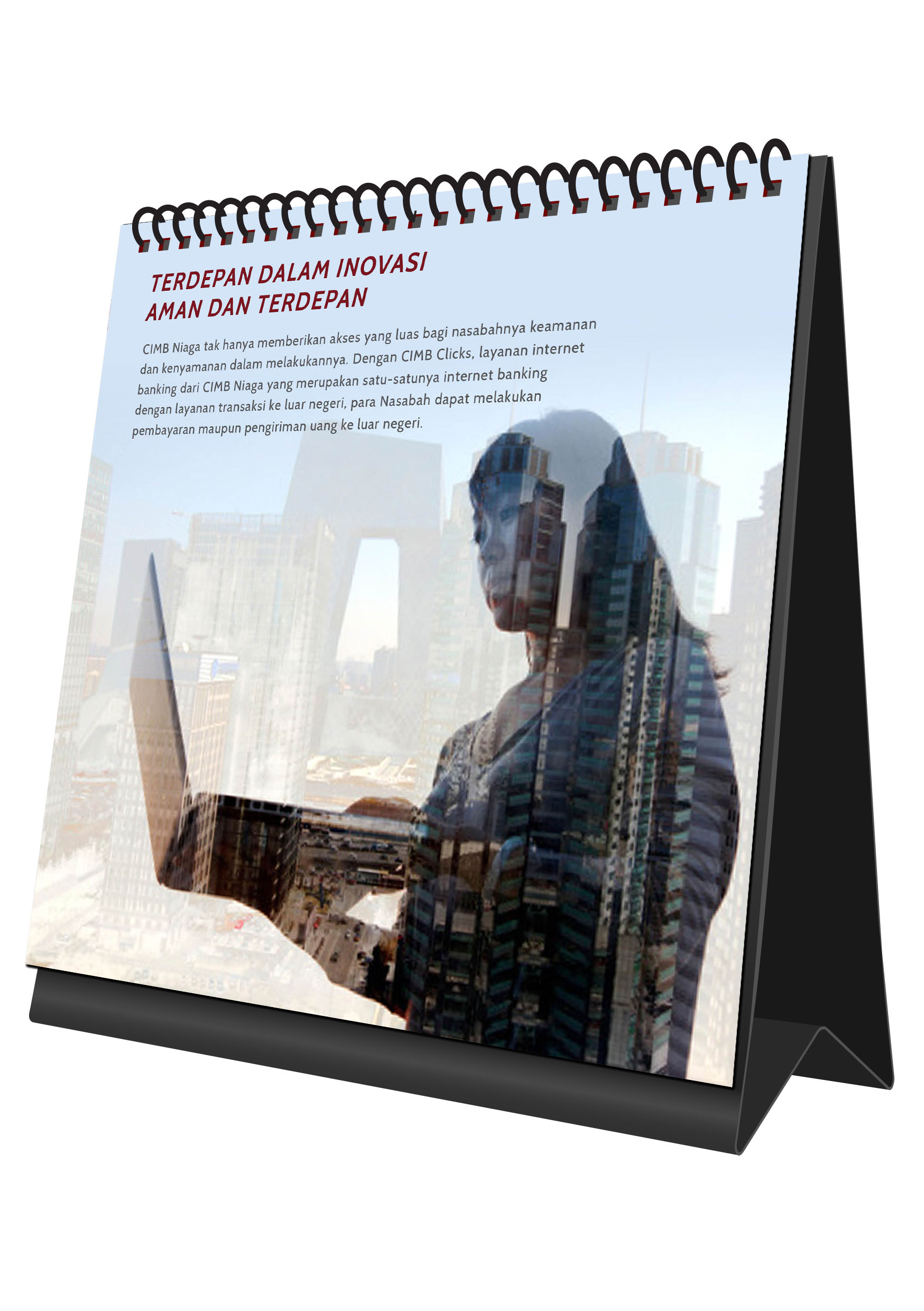 In visual of calendar we put 7 images with double impossed of 2 images that giving the double meaning. One is technology and two is access. The image will describe the innovation products that CIMB Niaga given through device application, such as: