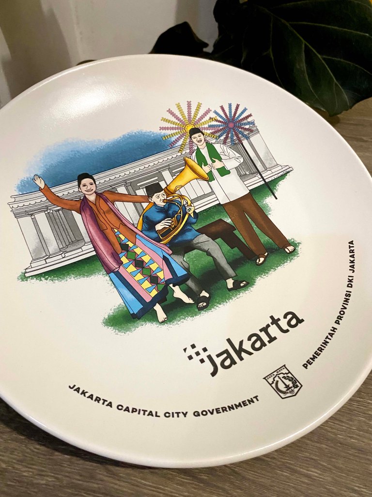 Promoting the city with unique merchandise not only giving the sense of appreciation but also branding the city. The illustration on ceramic describes the cultures of Betawi like the traditional clothes of Betawi tribes, one of tanjidor orchestra musician and with the background of The governor palace.