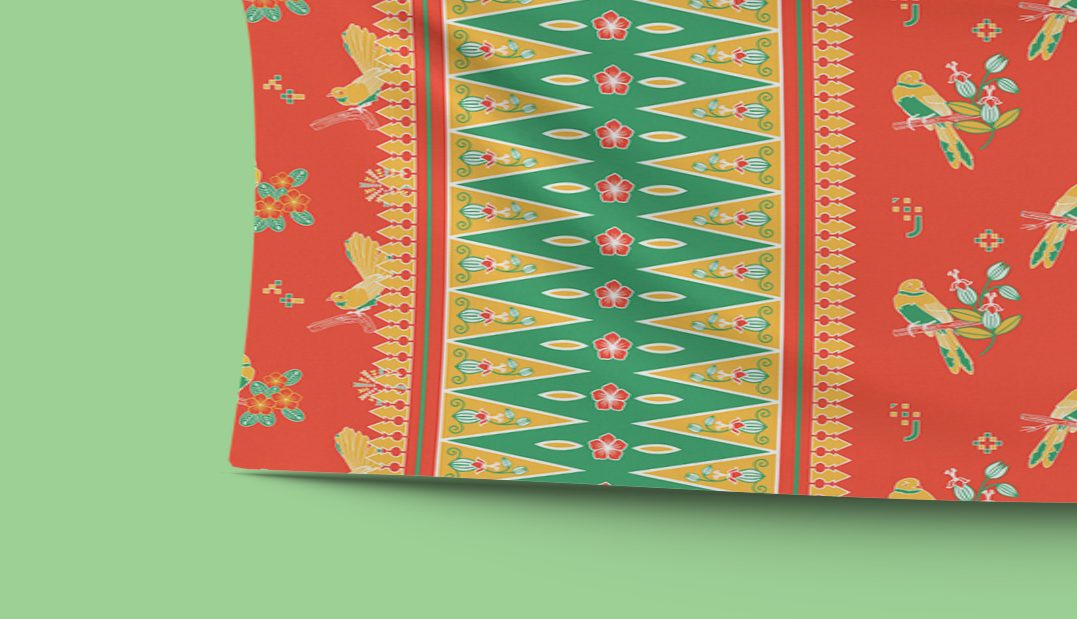 The Betawi Batik is characterized by the distinctive tumpal style, showcasing vibrant hues reminiscent of Jakarta’s lively atmosphere. Its patterns feature the beloved avian resident of Jakarta, the Burung Kipasan Belang (Rhipidura javanica), commonly spotted around mangroves. This bird boasts brown plumage with a striking straight white tail feather. Complementing this avian motif are depictions of Jakarta’s native flora, including the Bunga Tapak Dara (Catharanthus roseus), known for its five-petaled blooms in shades of pink and white, often seen gracing the neighborhoods of Jakarta. Additionally, the batik incorporates the bunga nona makan sirih (Clerodendrum thomsoniae), another botanical presence in Jakarta’s residential areas.