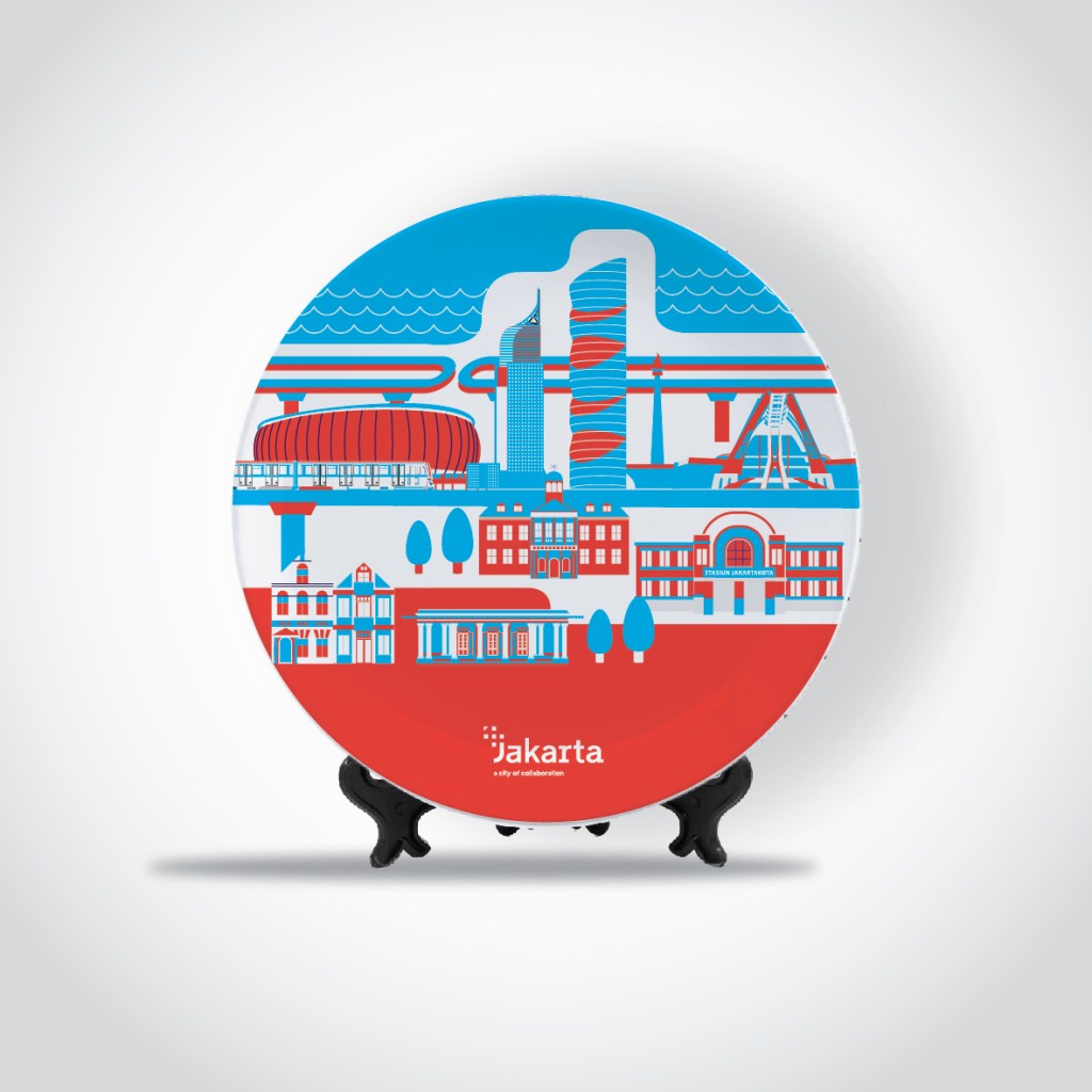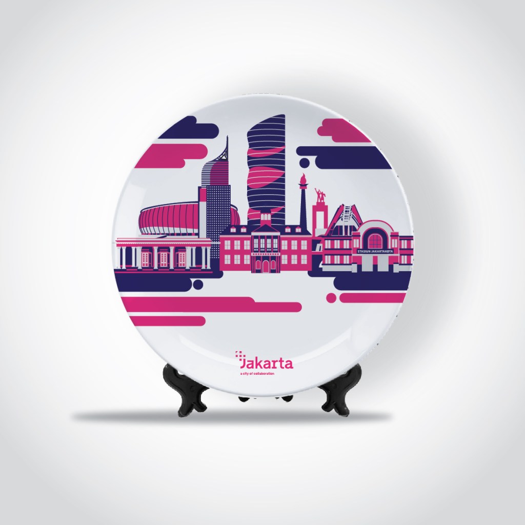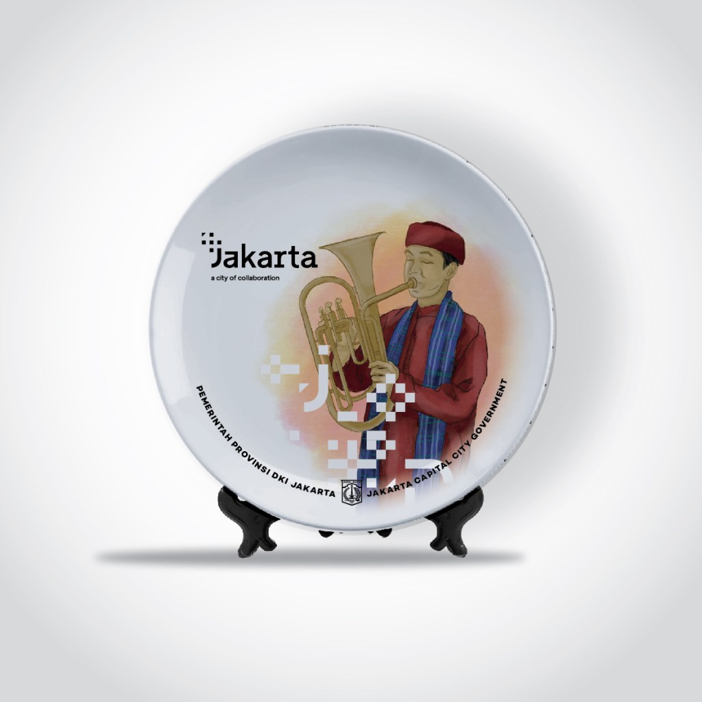 Promoting the city with unique merchandise not only giving the sense of appreciation but also branding the city. The illustration on ceramic describes the cultures of Betawi like the traditional clothes of Betawi tribes, one of tanjidor orchestra musician and with the background of The governor palace.
